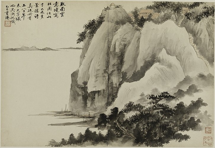 这是吴湖帆根据《多景楼》诗意为米芾这件名作配画的画页,以灵活的笔墨图写北固山上多景楼临江独峙的高旷寥廓之景,点染潇洒,颇有米氏风韵,亦足见吴对这件作品的珍视之心。