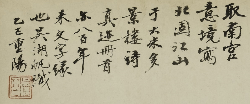 吴湖帆题跋释文: “取南宮意境,寫北固江山於大米《多景樓詩》真迹冊首,亦八百年來文字緣也。吴湖帆識,乙巳(1965)重陽。”