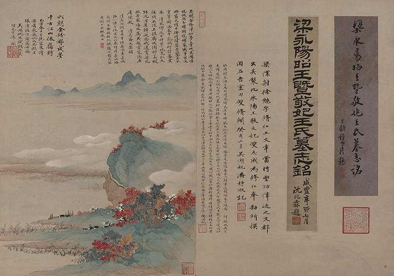 对于自己心爱的藏品,吴湖帆往往欣然命笔以诗词、绘画的形式品评赞叹,抒发喜爱之情,且每以与藏品相关的笔法、风格出之,如《多景楼图》以米氏风格点染,《梅景书屋》出以宋院体格局,《画禅室小景补图》仿董其昌笔墨等。《 宋拓 梁萧敷敬妃墓志铭合册》亦为吴氏家传之珍,尤所偏爱,因其原石为六朝遗物,故吴湖帆于册前作青绿山水一页,以“张僧鹞法”图写,笔法精细,设色大胆,而能艳不伤雅,颇得高古气韵。