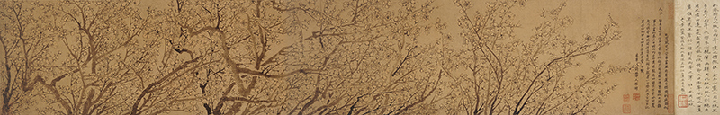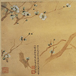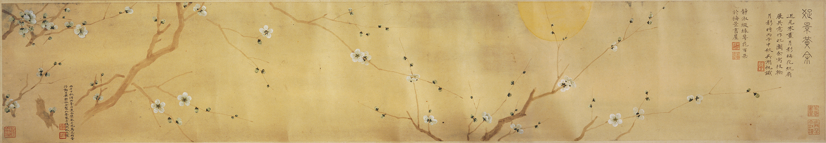 吴湖帆夫妇志趣相投,于诗词书画之道用心甚深,不但共同鉴藏,更常合作题写染翰。1936年,吴湖帆得罗聘、方婉仪夫妇合作《梅花图》卷,即罗聘以王冕繁梅之法所绘,其妻方婉仪以画面不甚分明,取牵牛花浸汁渍染花瓣,使之一目了然。吴氏夫妻追慕前人韵事,亦合作一卷装裱其后,潘静淑点缀梅花,吴湖帆补写枝干月影,越百年而再赋画眉添香、唱随于飞之雅调,洵为佳话。