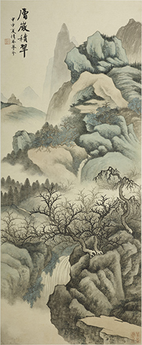 民国三十三年(1944) 纸本 设色 此图是吴湖帆青绿山水的代表作。图中描绘深山岩树的景致。近景的丛树纯用水墨,以不同的墨色营造出幽深的氛围。而山石则先以墨色为底,皴染出结构,再用极淡的色彩层层烘染,最后形成色墨互不相碍且相互生发的效果。因为这种新颖的设色技巧,使吴湖帆的青绿山水既有传统青绿山水鲜明的色彩,又保有水墨山水丰富的笔墨变化,形成妍丽而文雅、深厚而清秀的独特画风。此图作于1944年,作者时年五十一岁。