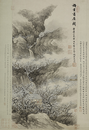 民国十八年(1929) 纸本 设色 此图为吴湖帆三十六岁所绘,出以唐寅笔法。图中山涧幽谷,白梅万点,茅屋掩映其间。室内有一雅士与女史凭案对坐,当为吴氏夫妻自况。 裱边为吴湖帆、潘静淑伉俪集选南宋词人吴文英《梦窗词》句,据《瑞鹤仙》和《烛影摇红》词牌所填新词,与图画情景相得益彰。二词另见于刘定之为吴湖帆重装的《梅花喜神谱》册内。