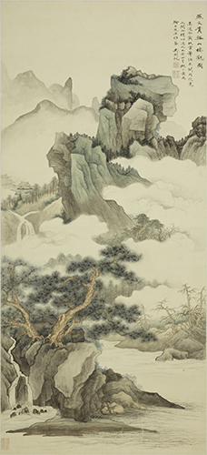 民国二十四年(1935) 纸本 设色 此图为吴湖帆仿北宋画家燕文贵(967-1044)画作。图绘远山巍峨,层峦叠嶂,云气蒸腾。近景古松遒劲,溪水潺潺。吴湖帆四十一岁成为故宫博物院审查委员,所见宋元名迹甚多。过眼之余,其于摹写又能形神俱似,笔益精炼,神明焕然,画乃益进。吴湖帆在艺术创作上善于融会贯通,其深植在心底的根基还是宋元文人画传统。此图作于1935年,作者时年四十二岁。