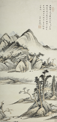 民国二十一年(1932) 纸本 设色 吴湖帆山水从董其昌、“四王”出,早期作品受到的影响尤深。此图作于 1932年,吴湖帆时年三十九岁,正是其山水画法发生变化,逐渐形成自身风格的时期。此图虽云学董其昌 与王鉴,其构图布景、山石形貌也确是华亭、“四王”家法,但其笔墨却已变董、王之清透而为腴秀,化生拙为绵厚,吴氏面貌已然呼之欲出。