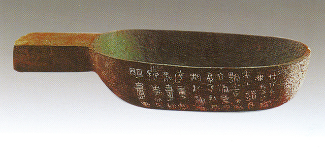 高4.8厘米,长24.6厘米,宽9.8厘米,容积490毫升。升呈椭圆形,一侧设空心短柄。器外刻有秦始皇诏书四十字。此器经实测容二升半,折合一升为196毫升,为秦代标准器。现藏天津博物馆。